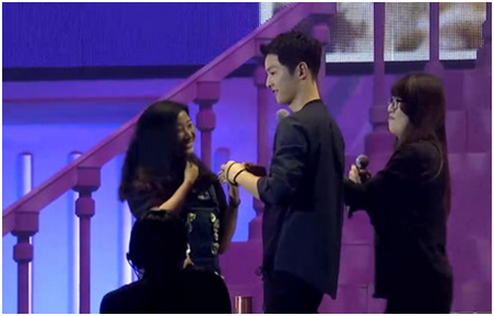 终于到了令人期待的游戏环节,干瞪眼、赞赞赞、石头剪刀布等让幸运粉丝又一次亲密接触仲基欧巴,并获得了由偶像男神亲手递出的尊龙套装作为参与奖品。